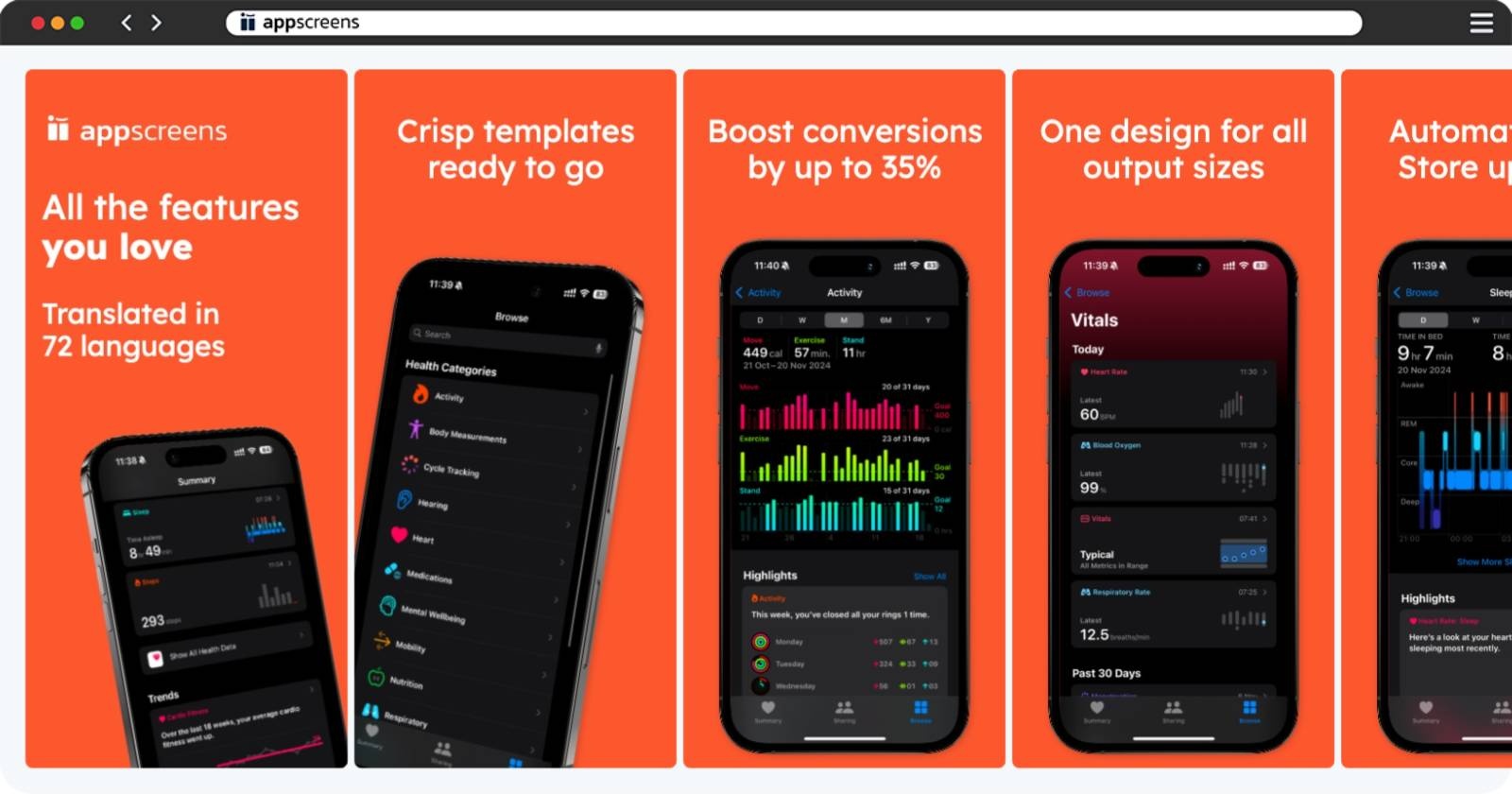This template simplifies creating professional app store screenshots, eliminating slow, manual processes involved with Photoshop (.psd), Sketch, or cluttered Figma templates. Our fully automated screenshot generator meets all Apple App Store and Google Play requirements, effortlessly providing optimized app store images. Quickly handle multiple devices, orientations, layouts, and easily localize your app screenshots into 80 languages. Enhance App Store Optimization (ASO), boost app downloads, and get found on the app stores with AppScreens.